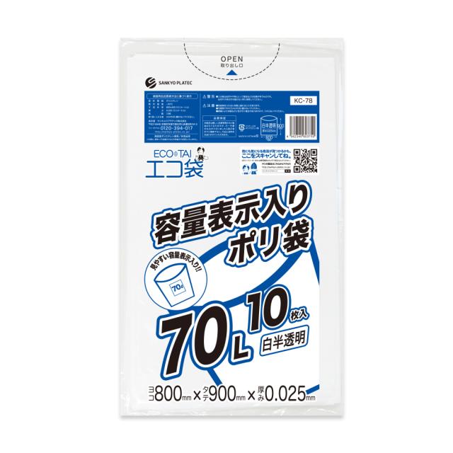 【バラ販売】KC-78bara 東京都容量表示ポリ袋 70リットル 0.025mm厚 白半透明 10枚/ ゴミ袋 ごみ袋