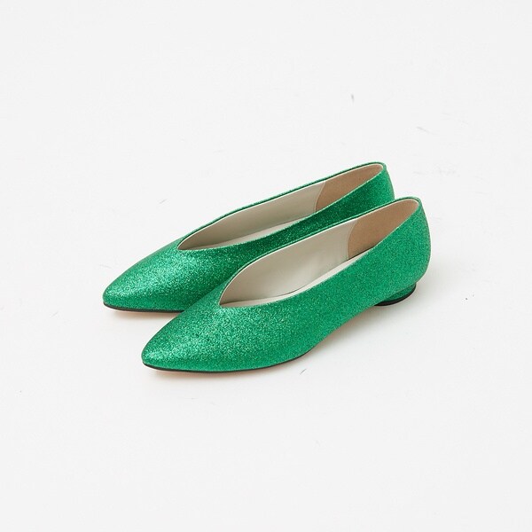 同モデルは、シンプルで上品なソフトポインテッドトゥに組み合わせたアーモンドカットの履き口にすることで、ペタンコでも脚長効果や足首細見え効果抜群の1足。