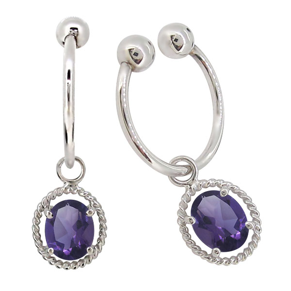 2月誕生石アメジストを使用したプラチナ製の、シンプルなツイストデザインのフープイヤリングです。