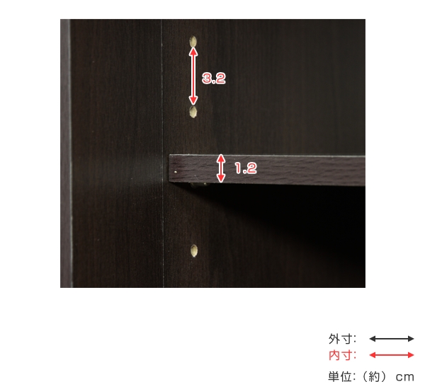4枚の可動棚板の高さを調整して頂く事のできるシューズボックスです。ダボ穴の間隔は3.2cmです。サンダルやスニーカーなどの高さに合わせて調節可能で、無駄なく収納して頂く事ができます。