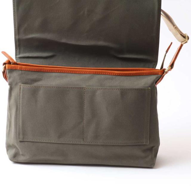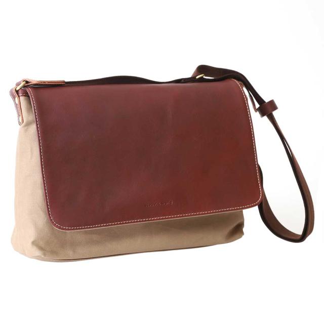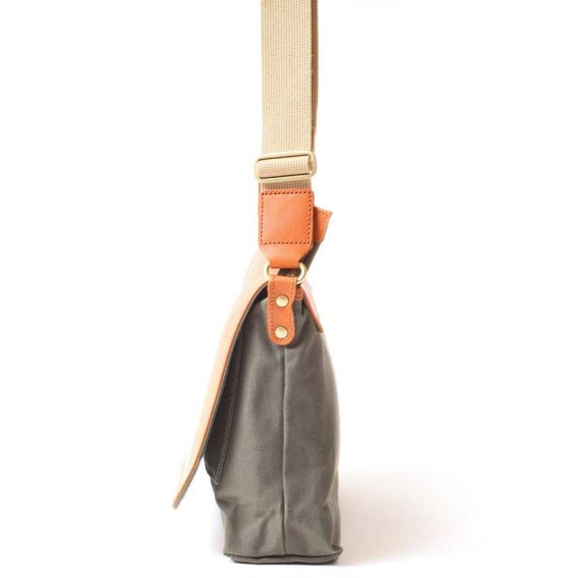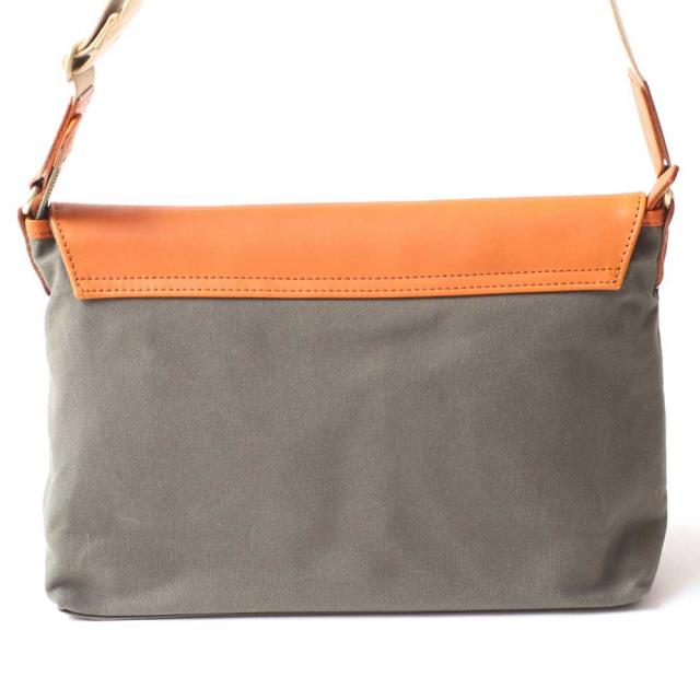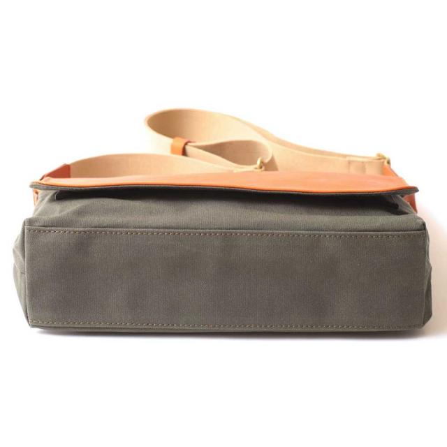10号帆布と牛革のかぶせ。トラディショナルデザインの横型ショルダーは不動の人気の定番商品で。コンパクトなサイズですが、A4サイズ書類もすっぽり。