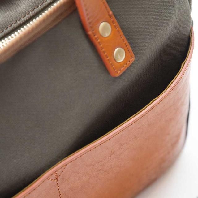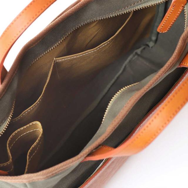 内側と外側にポケットを装着。A4がすっぽりと収まりシンプルにまとまります。コンパクトなのにA4サイズが横に楽々、A4サイズを横にしてファスナーがしっかり閉まります。中にペットボトルや傘が自由に収納できる内ポケットを装着。携帯、パスケースが入る外側の大き目ポケットは、タンニンナメシ革で緩みのないキュッとした収まりです。