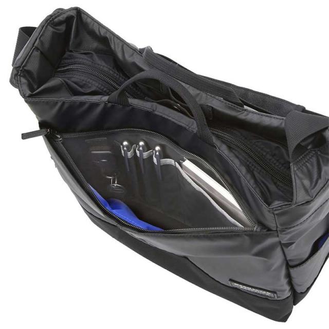 強力に水を弾く特殊加工を施し軽量でありながら耐水性、撥水性に非常に優れた素材です。(素材に撥水加工を施しておりますが、縫い目・ファスナー部分は撥水ではございませんのでご注意ください)■便利な手持ちハンドル付きの多機能ショルダーバッグこだわりの機能が充実して、幅広く使える多機能ショルダー。A4サイズもしっかり収まる、使い易いサイズでカジュアルにもビジネスでも活躍します。※本製品は特殊なコーティング加工を施しておりますが、コーティングは恒久的なものではなくご使用中に加水分解など経年劣化による剥離や摩耗が徐々に進行してまいります。ご使用中の摩擦や擦れ、鋭利なもので突いたり引っ掛けたりした場合、コンクリート壁など硬いものに接触した場合、剥がれることがございますのでご注意ください。また、ストーブ・ドライヤー等の熱風を直接当てますと劣化の原因となりますのでおやめください。収納最大PCサイズ:W28.4×H21.5×D3cm容量:14L付属品:ショルダーパッド、キーリング