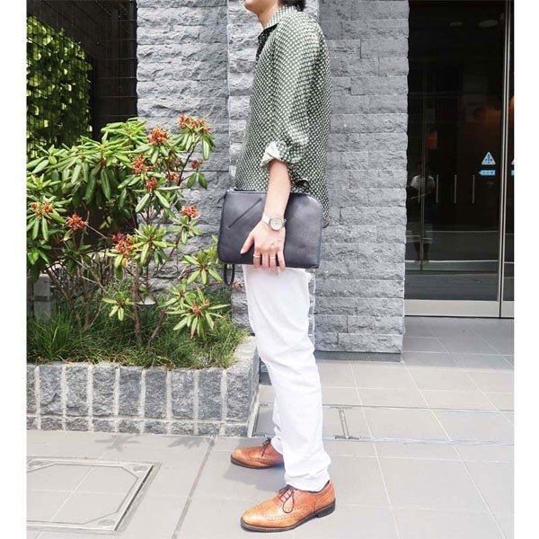 シンプルで上品なクラッチバッグです。男女兼用でお使いいただけます。光の当たり具合により、革製品ならではのシボ感と光沢感が見え隠れします。薄マチですが、本体内外にポケットも多数装備され、小物の収納にも優れています。中はスマホや音楽プレーヤーの収納にピッタリなマチ付きポケットや、イヤホンコード巻きなども付いています。また、内側にはヌメ革が使用されており、使い込む内に飴色に焼けていきます。革独特の経年変化もお楽しみいただけます。本体背面はストラップを取り外しできる仕様となっており、ストラップに手を通すことでより持ちやすくなります。
