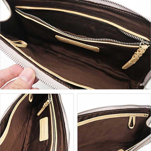 中身はシンプルで、大きく作られた差し込みポケットとファスナーポケット、ストラップホルダーなどが付いています。素材にはヌメ革と、高級感のあるツイルコットンを使用しています。