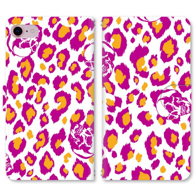 スマホケース 手帳型 iPhone13 iPhoneSE2 アイフォン 8 aquos sense GooglePixel xperia galaxyなど多機種制作対応 m2035_ホワイト×ピンク[ヒョウ柄×スカル]
