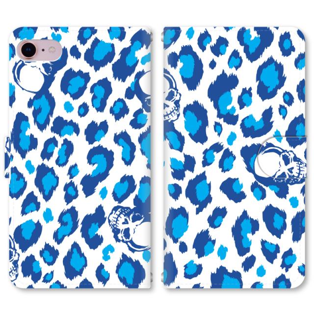 スマホケース 手帳型 iPhone13 iPhoneSE2 アイフォン 8 aquos sense GooglePixel xperia galaxyなど多機種制作対応 m2038_ホワイト×ブルー[ヒョウ柄×スカル]