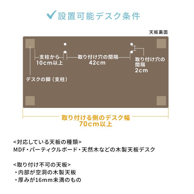 デスク支柱から10cm以上で取り付け穴の間隔がW42cm、奥行き2cm確保できるデスク