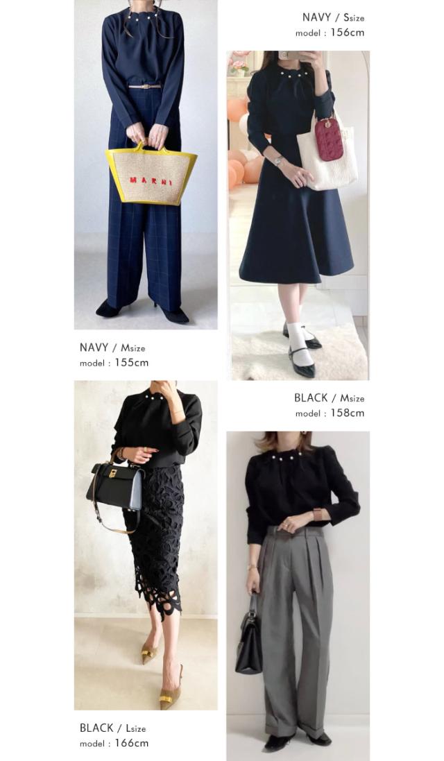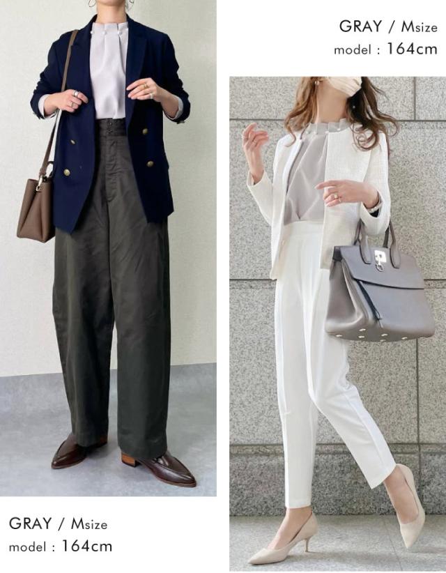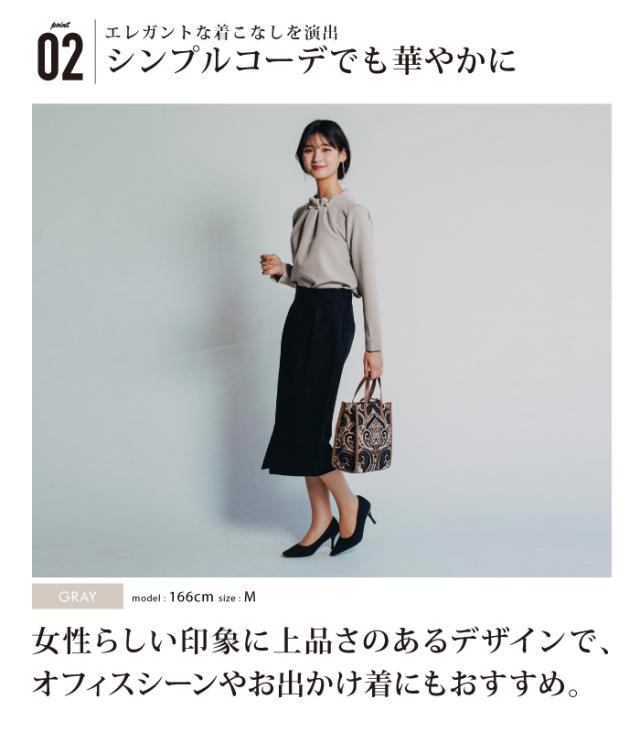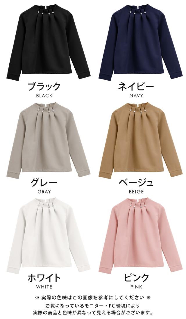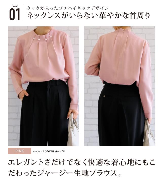 シンプルなコーディネートでもパールの存在感で上品かつ女性らしいスタイリングにキマるアイテム。タックが入ったプチハイネックデザインでネックレスがいらない華やかな首周り。エレガントさだけでなく快適な着心地にもこ だわったジャージー生地ブラウス。