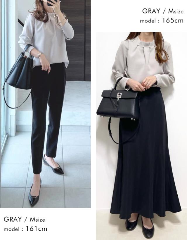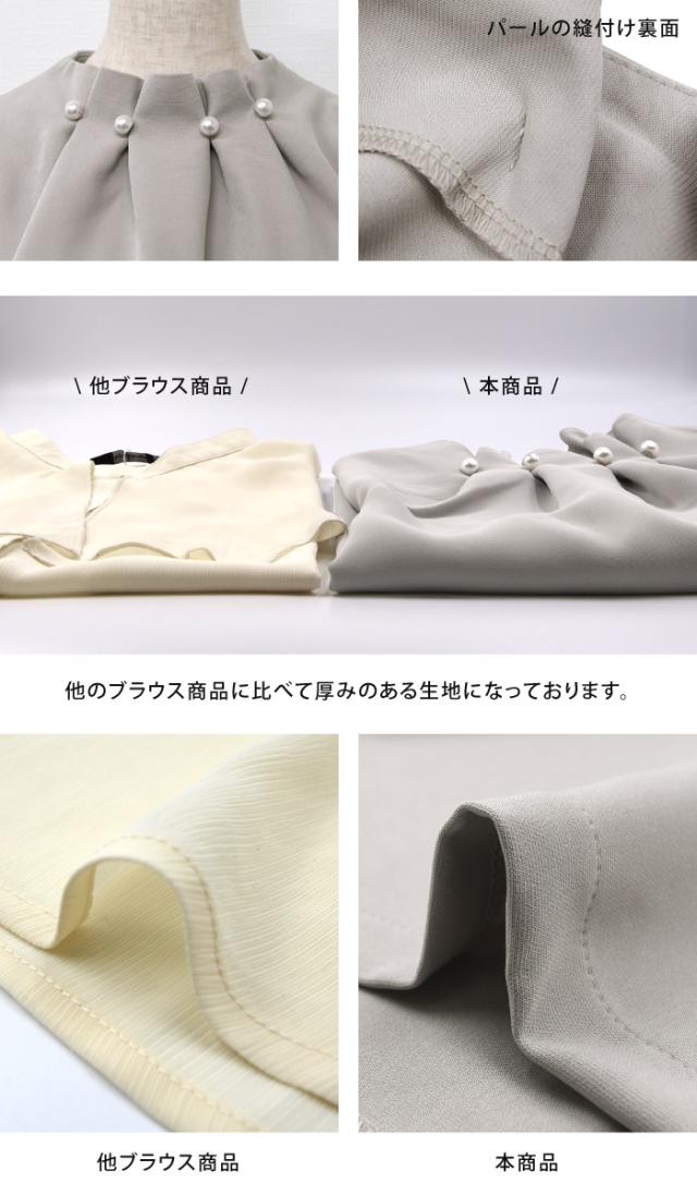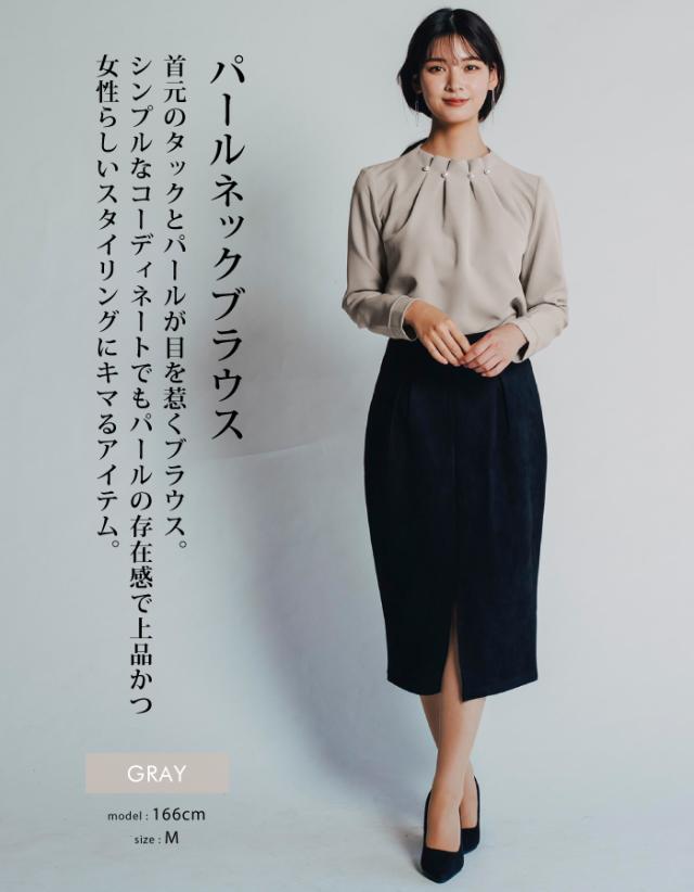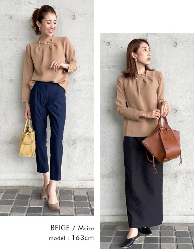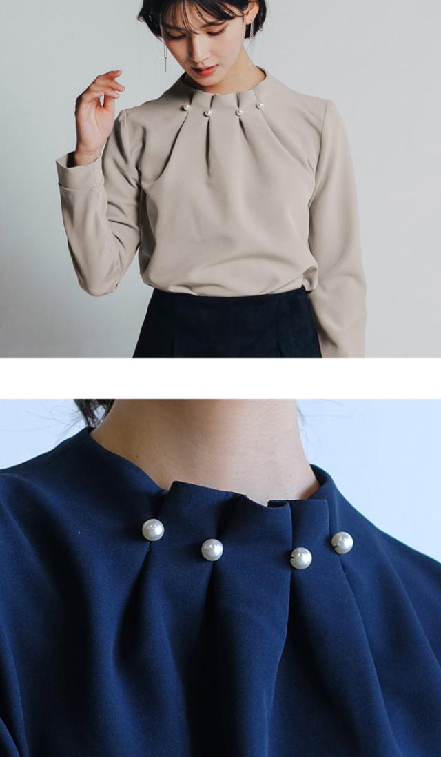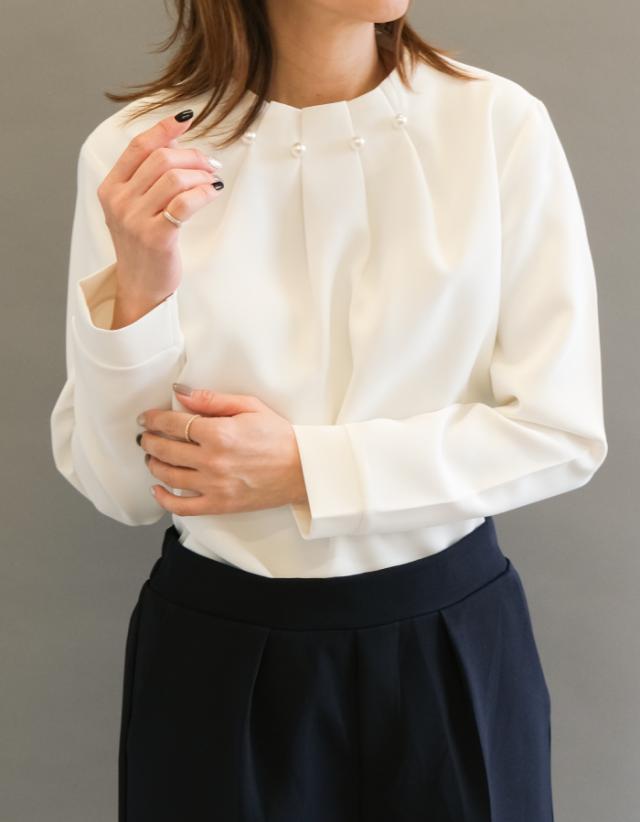 首元のタックとパールが目を惹くパールネックブラウス。