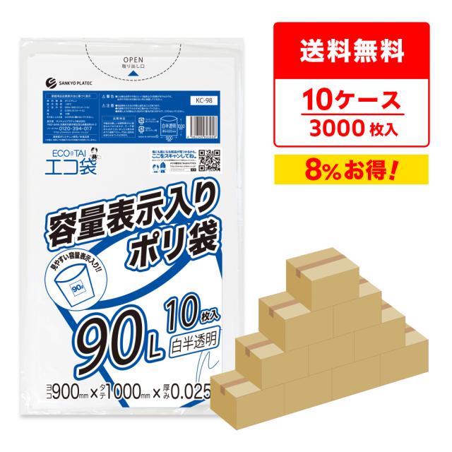 【まとめて10ケース】KC-98-10 東京都容量表示ポリ袋 90リットル 0.025mm厚 白半透明 10枚x30冊x10箱/ ゴミ袋 ごみ袋 送料無料