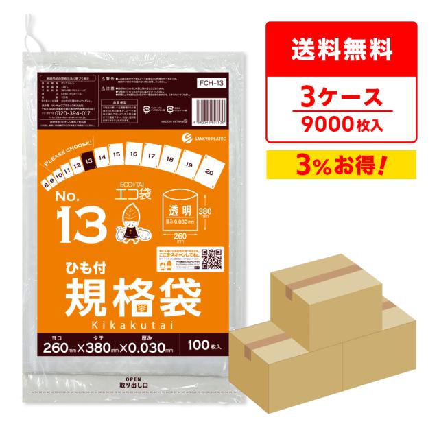 【まとめて3ケース】FCH-13-3 ひも付 規格袋 13号 0.030mm厚 透明 100枚x30冊x3箱 食品衛生法 RoHS指定 送料無料
