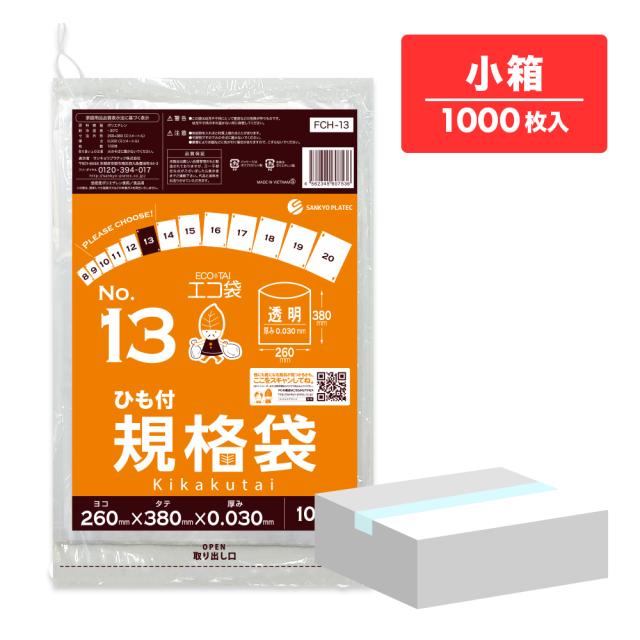 【小箱販売】FCH-13kobako ひも付 規格袋 13号 0.030mm厚 透明 100枚x10冊 食品衛生法 RoHS指定
