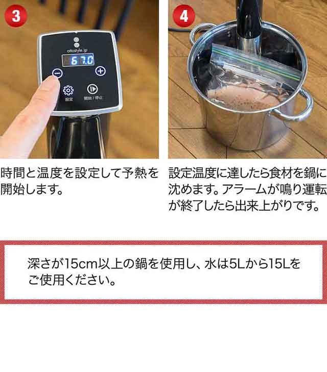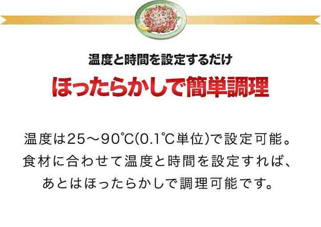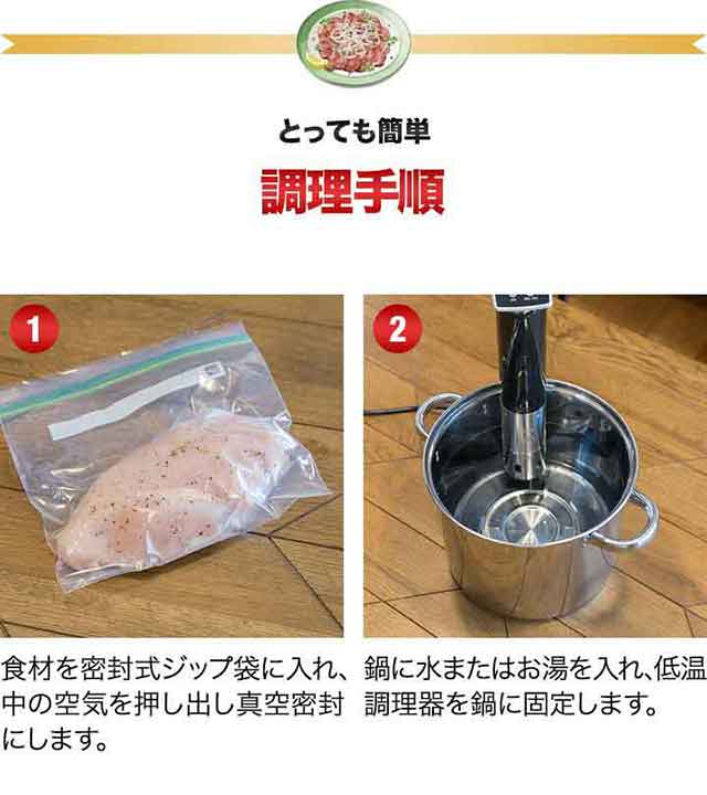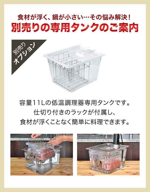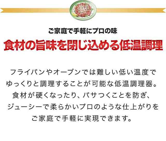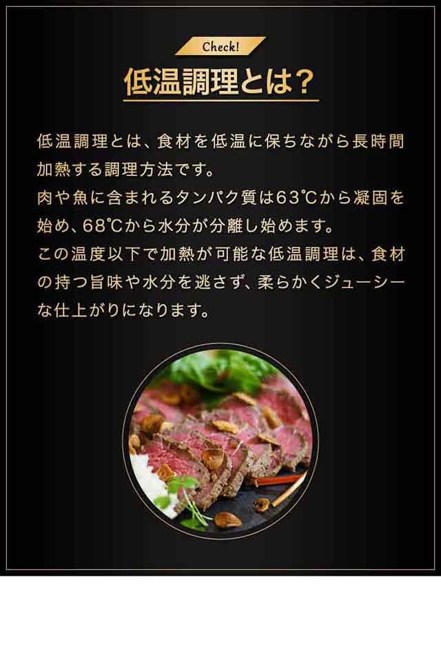 低温調理器 低温調理機 低温調理器具 スロークッカー オーブン代わり 低温加熱 ハイパワー 1000W 1,100W 自動 温度調節 タイマー機能 じっくり長時間 防水等級 IPX7 安心安全 PSE取得 クランプ固定 クリップ固定 ローストビーフ 蒸し鶏 サラダチキン チャーシュー ステーキ 肉料理 魚料理 下ごしらえ ダイエット献立 筋トレ献立 レシピ 使い方 おすすめ 本格料理 本格調理 調理家電 家電 キッチン家電 その他キッチン家電 スロークッカー キッチン・食器・調理 調理道具・下ごしらえ用品 その他調理道具・下ごしらえ用品