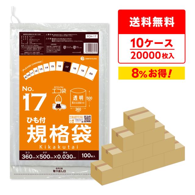 【まとめて10ケース】FCH-17-10 100枚x20冊x10箱 ひも付 規格袋 17号 0.030mm厚 透明 食品検査適合 RoHS指定 送料無料