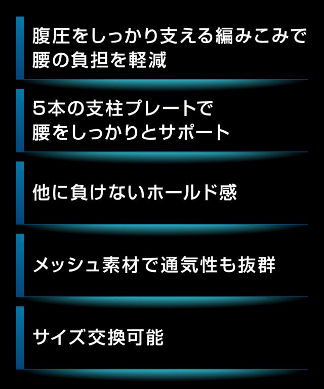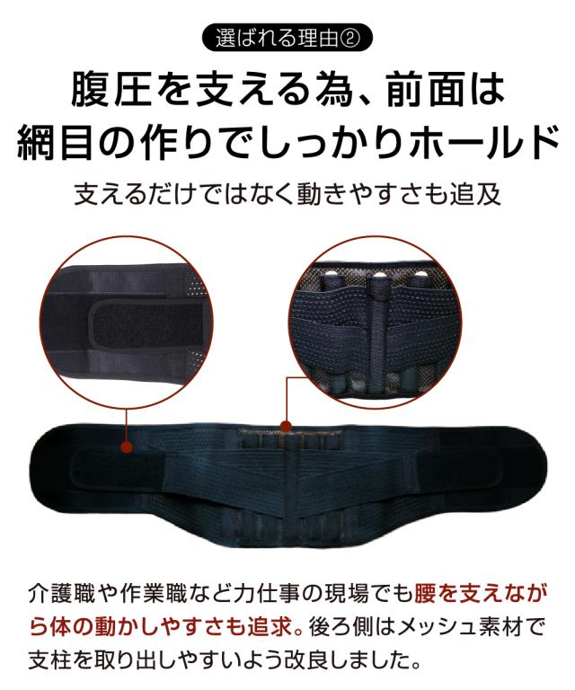 【しっかりしたホールド感】改良を重ねる事で真っ直ぐな固定を実現。しっかりとしたホールド感で介護職や作業職など、力仕事の現場でも十分なサポート力を発揮します。腰痛でお悩みの方、頼りにできます。