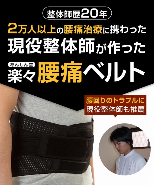 【治療家歴20年 現役整体師が約2万人の治療経験から考案 】腰痛治療の専門家として、約2万人以上に寄り添い続ける現役治療家が考案。あんしん堂「楽々腰痛ベルト」。