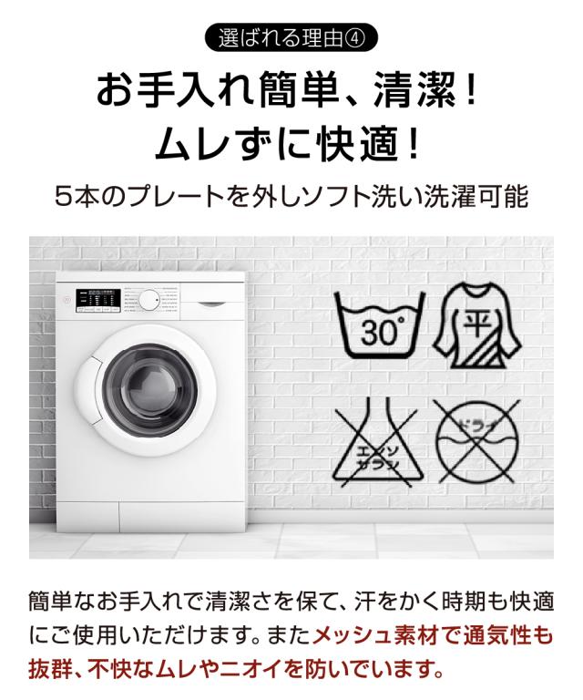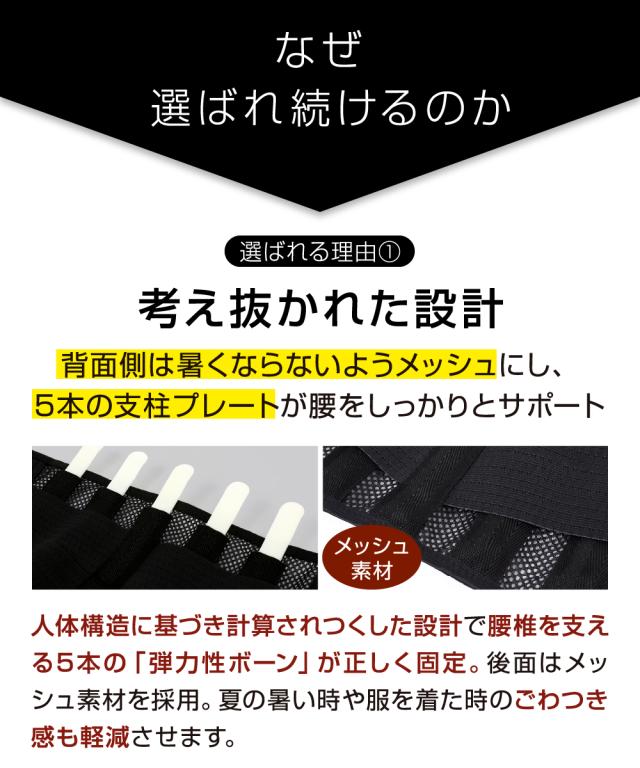 【人工構造に基づき計算されつくした設計 5プレート構造】腰を支える後面は5本の「弾力性ボーン」と「メッシュ素材」で制作。プレートが腰をしっかりと支え、日常生活や仕事などでの腰への負担を柔らげます。 支柱は抜き差しが簡単に出来るのでサポート力を自由に調節する事が可能です。