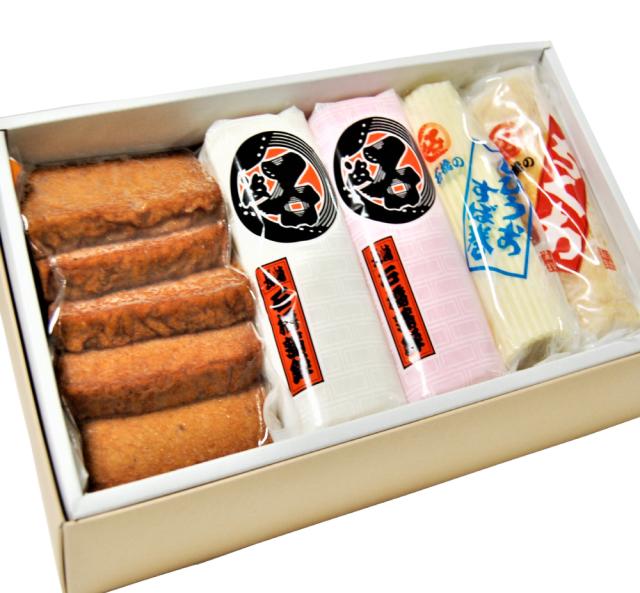 板付(竹)赤×1 白×1(180g)、とびうおすぼ巻×1(90g)、 特製ちくわ×1(135g)いわしからあげ(5枚入)
