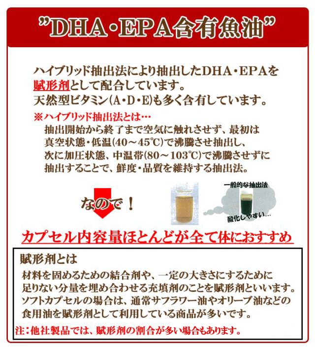 | □原材料名 DHA・EPA含有魚油(国内製造)、黒酢もろみ末、発酵黒にんにく末、卵黄油(卵を含む)、しょうが末、ゼラチン、グリセリン、焼成カルシウム、ミツロウ、ビタミンB1、グリセリン脂肪酸エステル、ビタミンC |
