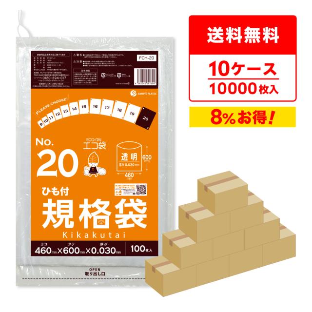 【まとめて10ケース】FCH-20-10 ひも付 規格袋 20号 0.030mm厚 透明 100枚x10冊x10箱 食品衛生法 RoHS指定 送料無料
