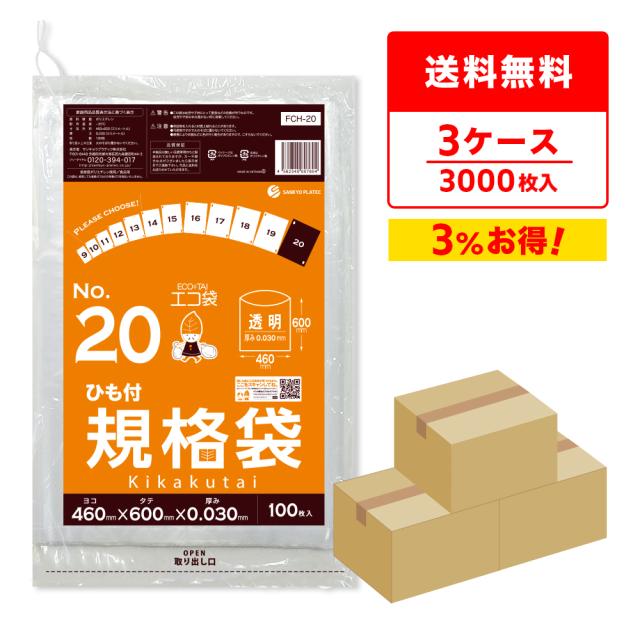 【まとめて3ケース】FCH-20-3 ひも付 規格袋 20号 0.030mm厚 透明 100枚x10冊x3箱 食品衛生法 RoHS指定 送料無料