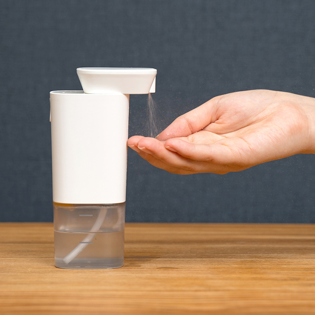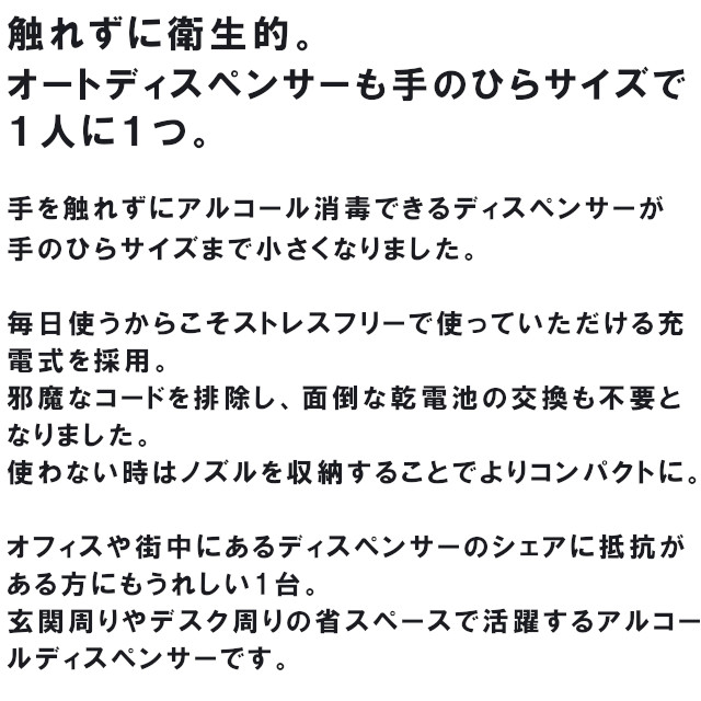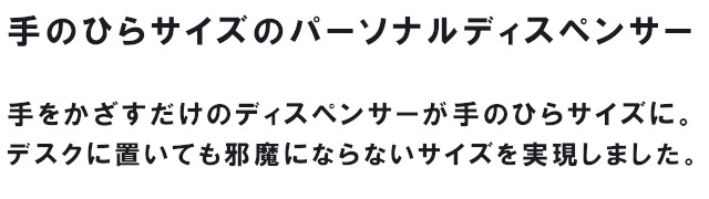 手を触れずにアルコール消毒できるディスペンサーが手のひらサイズまで小さくなりました。
