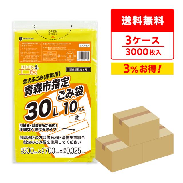 【まとめて3ケース】SAO-30-3 青森市指定ごみ袋 エコ袋 30リットル 0.025mm厚 黄色 10枚x100冊x3箱 / ゴミ袋 ごみ袋 送料無料