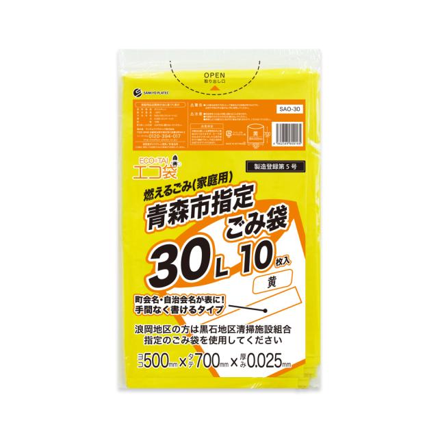 【バラ販売】SAO-30bara 青森市指定ごみ袋 エコ袋 30リットル 0.025mm厚 黄色 10枚/ ゴミ袋 ごみ袋
