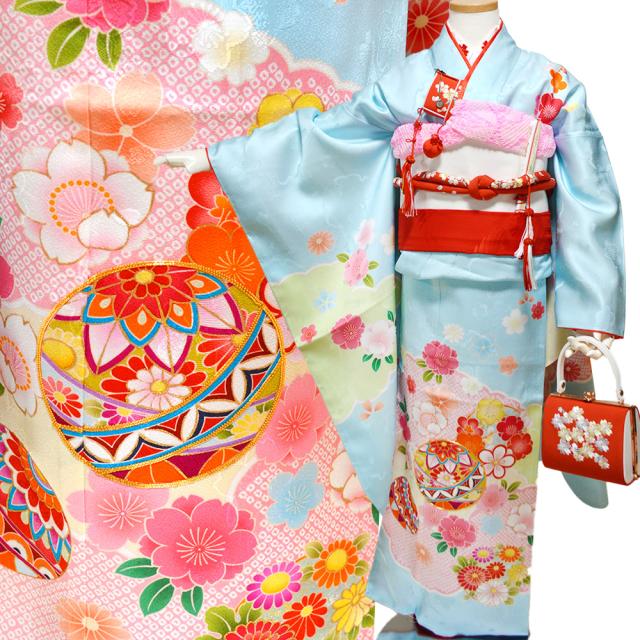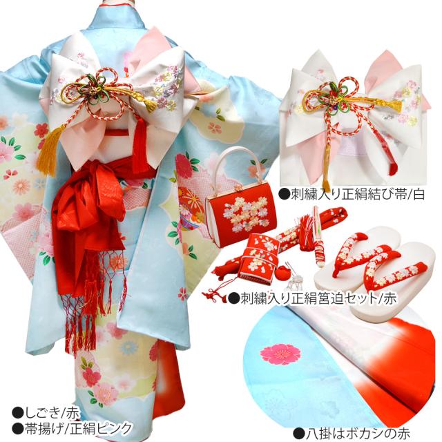 着物(四つ身)・重ね衿・長襦袢・御祝帯・草履・バッグ・丸ぐけ・はこせこ・扇子・びらかんざし・帯揚げ・しごき・足袋(19-20cm、ストレッチタイプのソックス型)・腰紐3本