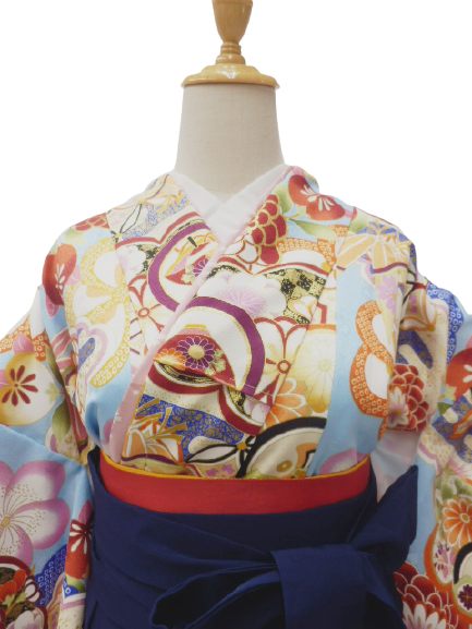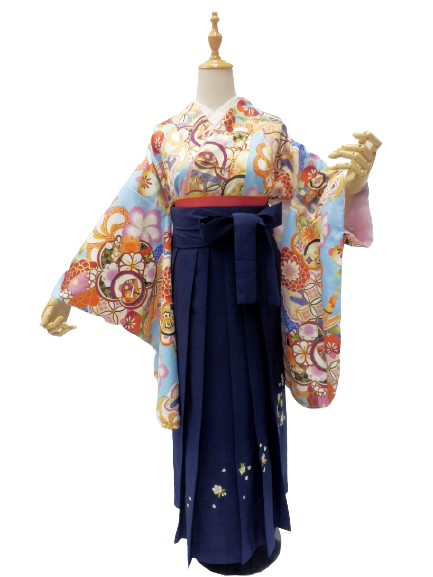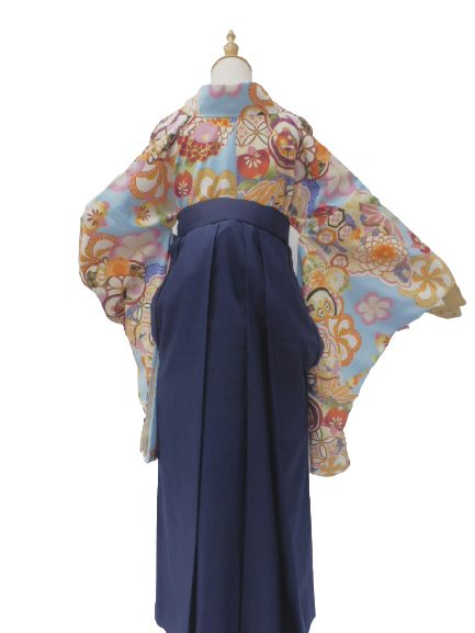 【レンタル】小学生 卒業式 袴 女の子 紋付き袴 フルセット 往復送料無料 水色地 牡丹菊 柄No.337