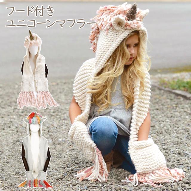 在庫処分 フード付き ユニコーン ニット マフラー キッズ ベビー 帽子 フード 女の子 ガールズ レディース ファッション 子供 子ども こども メール便