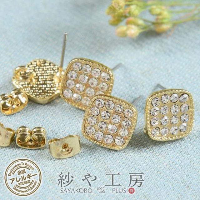 ピアスパーツ 316L ステンレス ニッケルフリー 2ペア 4個 キャッチ付 変退色防止加工済 金属アレルギー対応 ポストピアス ストーン付 スクエアプレート 12mm