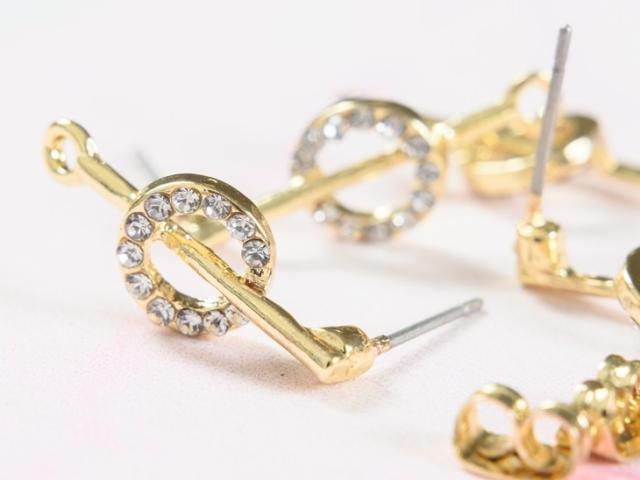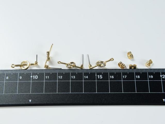 ストーン付きのサークルパーツを貫くようにスティックパーツがあしらわれた少し個性的なデザインのピアスパーツです。