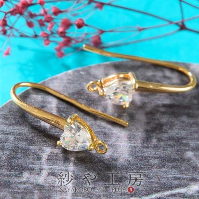 ピアスパーツ ストーン付1ペア 2個 フックタイプ 大粒 ハート ストーン カン付 ゴールド 23.5mm 約2.4cm アクセサリーパーツ アレルギー対応 メタルパーツ 金属チャーム ピアス パーツ 問屋 ハンドメイド資材 ピアスフック 石付き ハート型 さや工房 手作り
