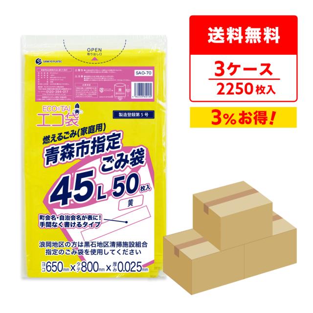 【まとめて3ケース】SAO-70-3 青森市指定ごみ袋 エコ袋 45リットル 0.25mm厚 黄色 50枚x15冊x3箱/ ゴミ袋 ごみ袋 送料無料