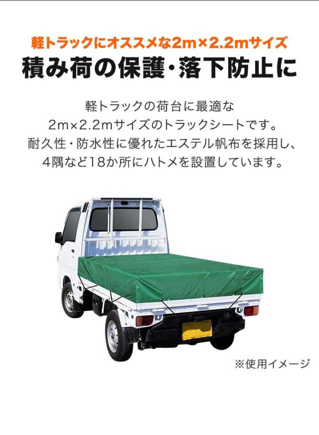 積み荷の保護・落下防止に。軽トラックの荷台に最適な2m×2.2mサイズのトラックシートです。耐久性・防水性に優れたエステル帆布を採用し、4隅など18か所にハトメを設置しています。