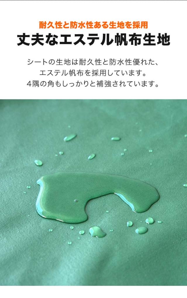 シートの生地は耐久性と防水性優れた、エステル帆布を採用しています。4隅の角もしっかりと補強されています。