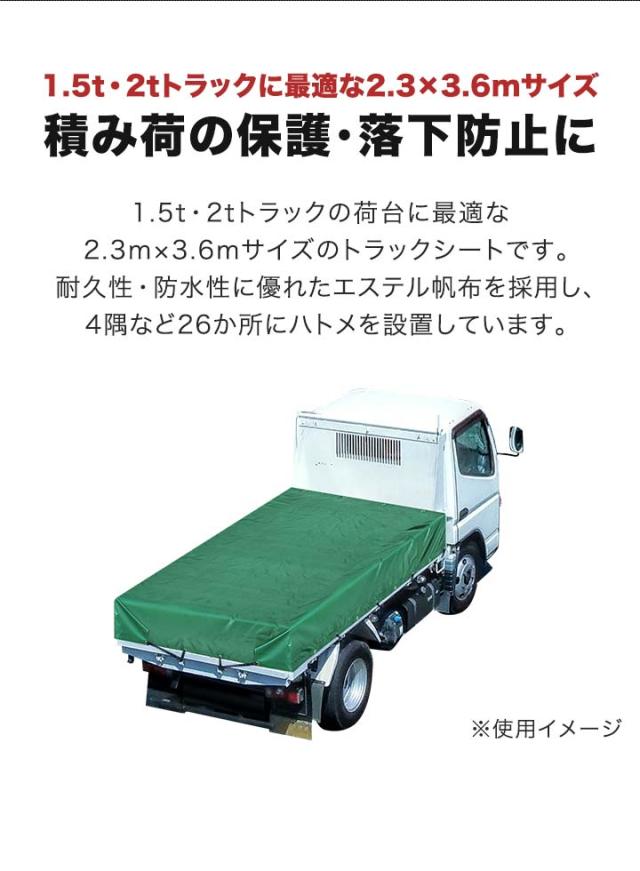 積み荷の保護・落下防止に。1.5t・2tトラックの小型トラックの荷台に最適な2.3m×3.6mサイズのトラックシートです。耐久性・防水性に優れたエステル帆布を採用し、4隅など26か所にハトメを設置しています。
