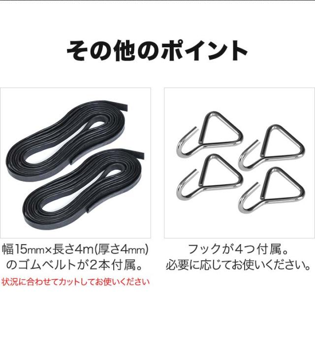 長さ4mのゴムベルト2本、荷掛けフック4つ付属。