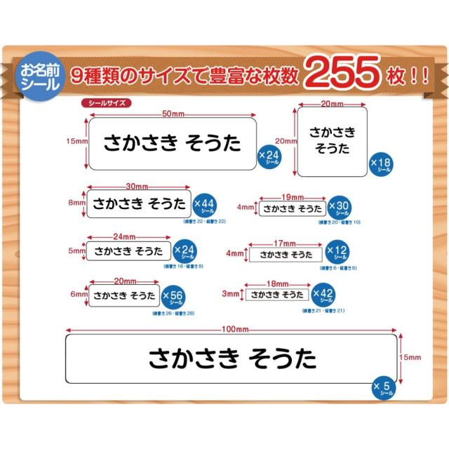 お弁当箱やハサミなどの小物、クレヨンや色鉛筆などの細くて小さいものにまで様々なアイテムに貼れるようサイズも豊富に取り揃えております。