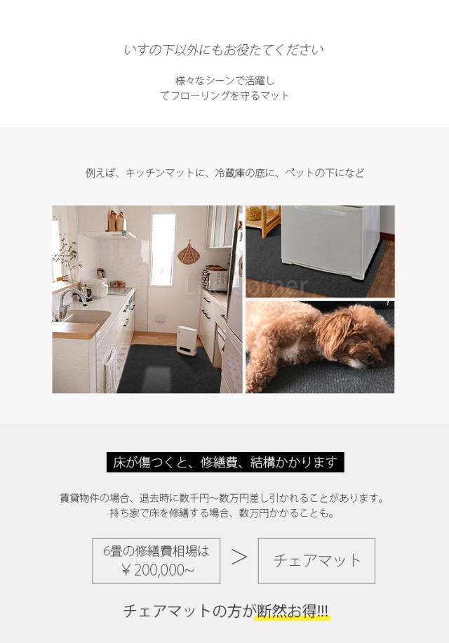 | ・床やフローリングを保護します、オフィスチェア、ゲーミングチェア、ダイニングチェア、椅子などによるの傷や凹みから守る床保護マットです! ・キャスター、家具、走り回る犬や猫などが床に直接触れるのを防ぎ、傷はもちろん長期間の利用でこびりついてしまう汚れも防いでくれます。 ・裏はずれない吸着加工、無数の吸盤ができたようにくっつく仕組みでシールを剥がして貼るだけピタックと床に密着。 ・表面は絨毯のようなループ状の生地でキャスターの転がる音を吸収し抑える効果があるチェアマットです。 ・使用時、裏面の透明フィルムをはがしてから床に敷いて、折り目が数日に元に戻れます。 ・使わない時は巻き取り簡単に収納できます。 ・冷たさを軽減する上に肌触りもいいですよ。夏はサラッと、冬は冷え対策に最適。 ・新築、賃貸マンションなどフローリングにキズや凹みを付けたくない方にぜひおすすめです。 ・チェアだけではなく、オフィスデスク、パソコンデスク、勉強机、床のキズ防止用に役に立ちます。どごでも使え、マルチカーペットです。 |