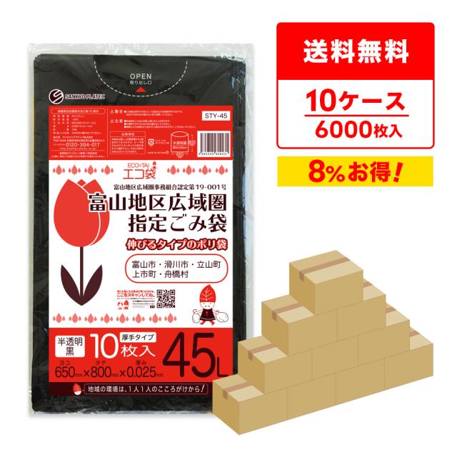 【まとめて10ケース】富山地区広域圏指定ごみ袋 45リットル 半透明黒 65x80cm 0.025mm厚 10枚x60冊x10箱 STY-45-10/ ゴミ袋 ごみ袋 家庭用 45l 送料無料