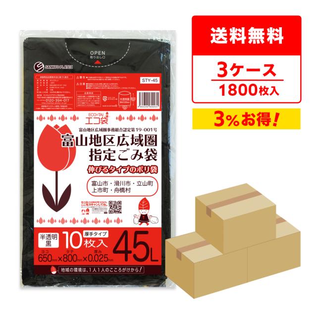 【まとめて3ケース】富山地区広域圏指定ごみ袋 45リットル 半透明黒 65x80cm 0.025mm厚 10枚x60冊x3箱 STY-45-3/ ゴミ袋 ごみ袋 家庭用 45l 送料無料