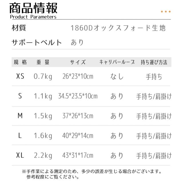 - 今までLを使っていましたがXLがあると知り購入しました。 ひとまわり大きいだけでだいぶ容量が変わるので大きさに大変満足しております。 中の仕切りなら一部が削られて大きめにえぐられている箇所が2箇所ほどありました。 そこだけ少し気になりました。