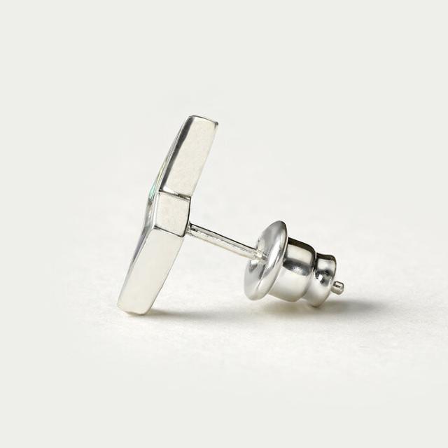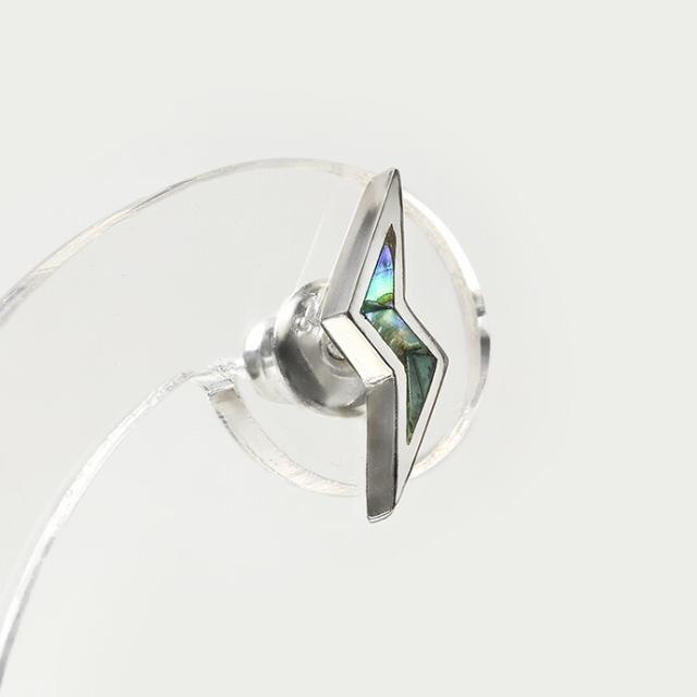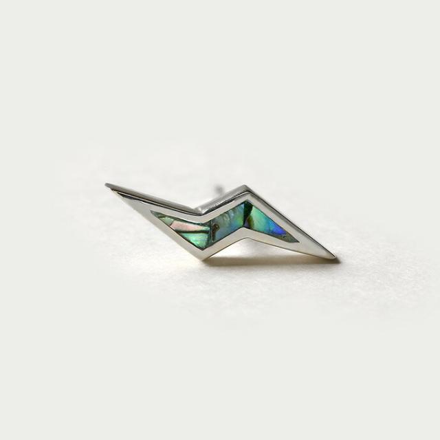 中心にカットしたシェル(貝)を埋め込んだ稲妻型のピアス。稲妻特有のユニークなフォルムが耳元に個性を演出。水面のような独特の模様を持つシェルが様々な色に輝きます。小振りなので女性にもオススメのピアスです。