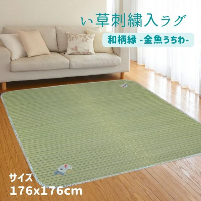 176x176cm(2畳用)かわいい金魚うちわ刺繍入り グリーン色 さらさら肌触りのい草ラグ 【不織布貼】
