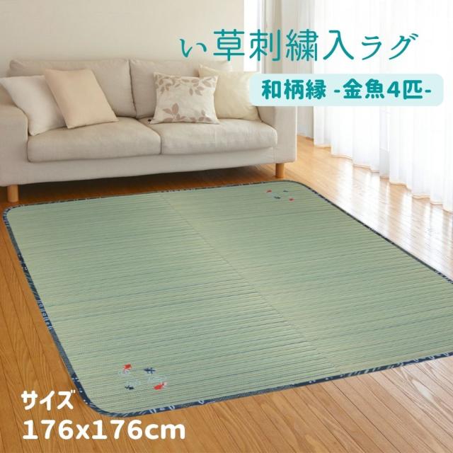 176x176cm(2畳用)かわいい金魚4匹刺繍入り ブルー色 さらさら肌触りのい草ラグ 【不織布貼】