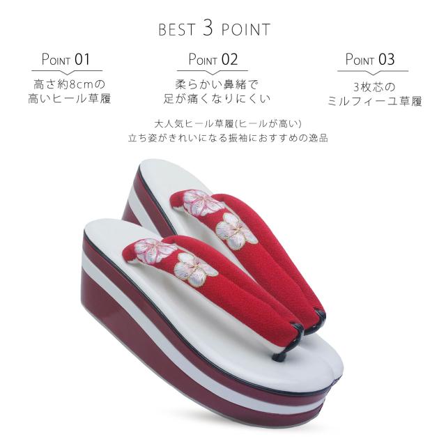 振袖用 厚底 3枚芯 刺繍の鼻緒がかわいい ヒール 草履 選べる8タイプ レディース 単品 エナメル 赤 白 黒 ミルフィーユ 桜 梅 椿 ねじり梅 成人式 前撮り 振袖