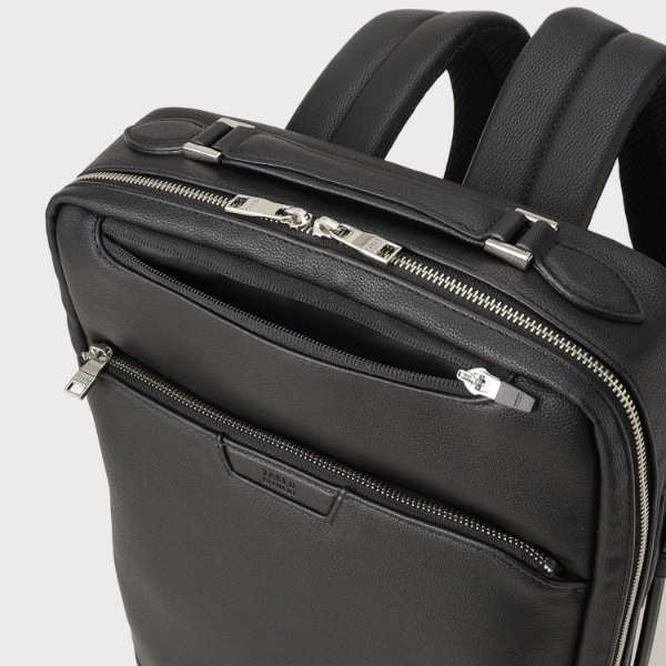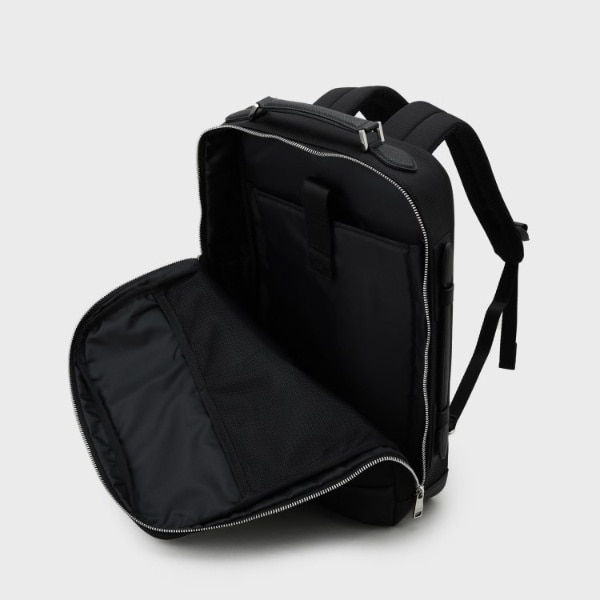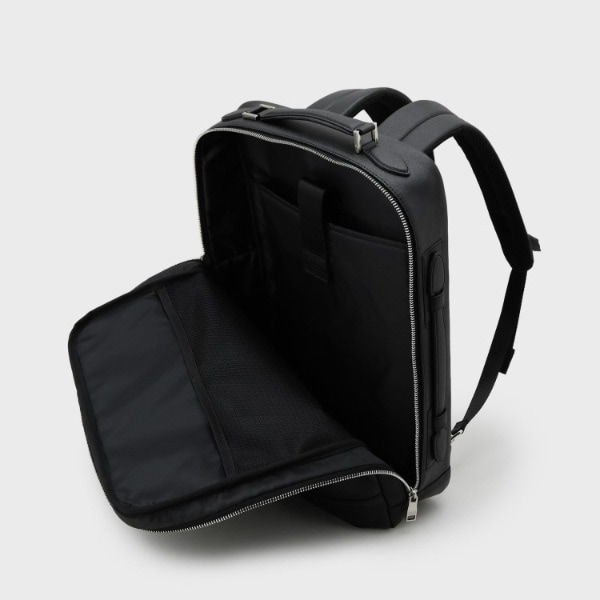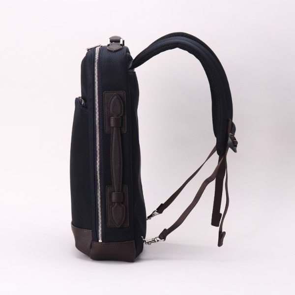 ・リュックのショルダー部分は背中側に収納が可能で、収納した場合、スライド式のハンドルで横持ちができ、電車通勤やTPOに合わせ、持ち方を変えられるのもデザインポイントになります。
